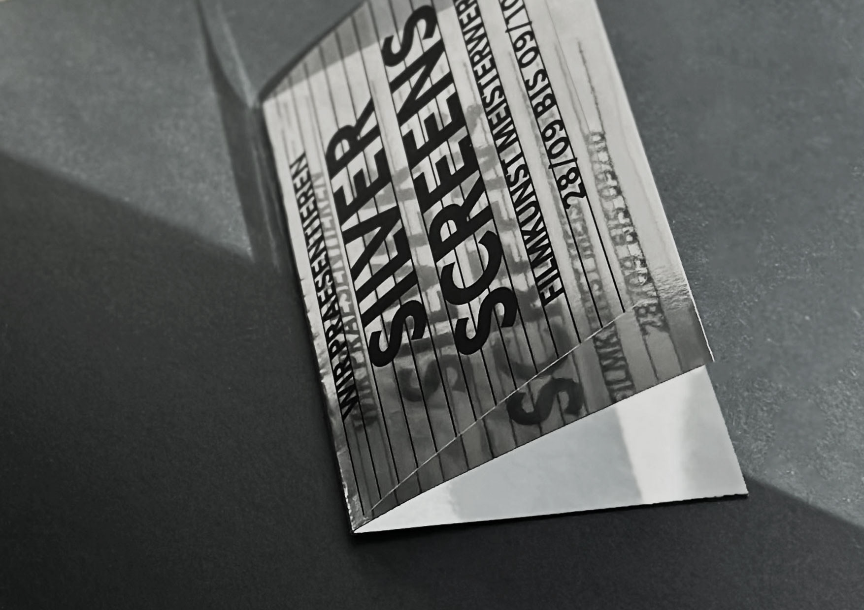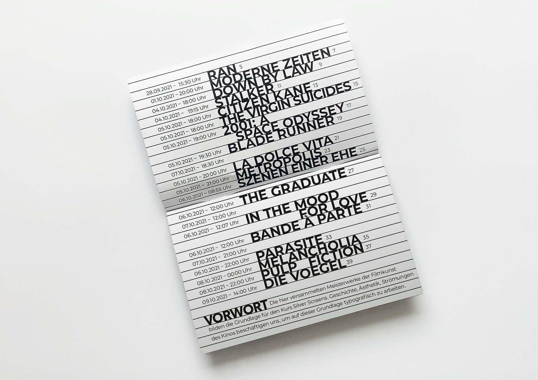 Minimalistic design of a movie programm booklet, based on known film-aesthetics.